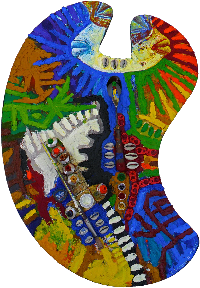Stanwyck Cromwell is a Guyanese-born contemporary artist. He lives and works in Connecticut since moving here in 1970, though his Caribbean roots serve as a visual footing for his work as he draws on memories full of saturated colors and patterns that make up his paintings. “A visual kaleidoscope from this exotic land, is referenced in my art. Coming from a tropical country, where everything is referenced by color, my art radiates a colorful energy that is both visually and spiritually stimulating. I find resiliency in being able to create artforms that reflect my rich and diverse culture.” His thick application of paint invites the viewer to physically enter Cromwell’s own world where the people of the Caribbean shine, radiating strength. His work combines both imaginary and spiritual concepts through myths and folklores, combining abstraction with representational. Cromwell’s work embodies his experiences as a human being and a Guyanese-born artist.